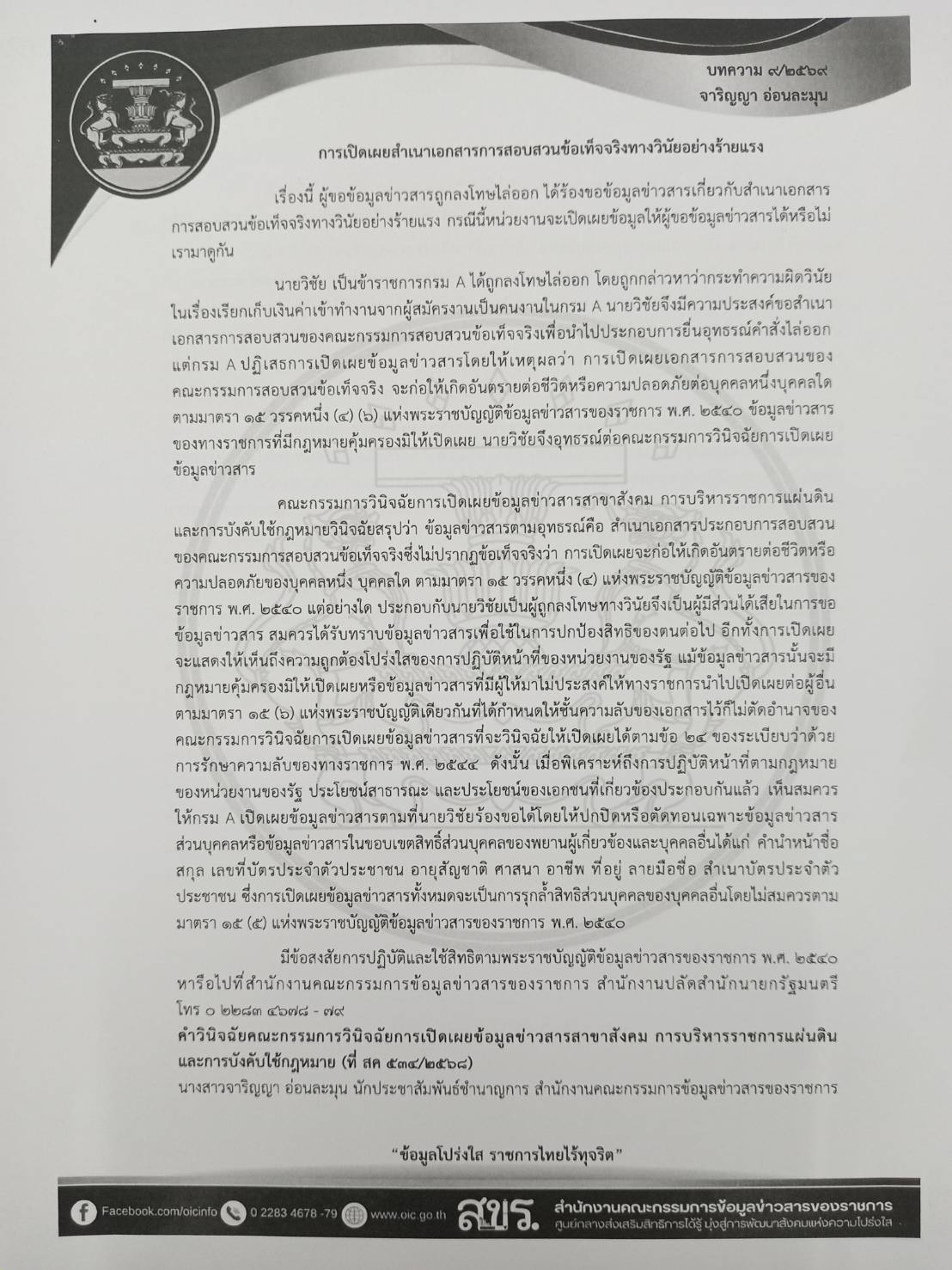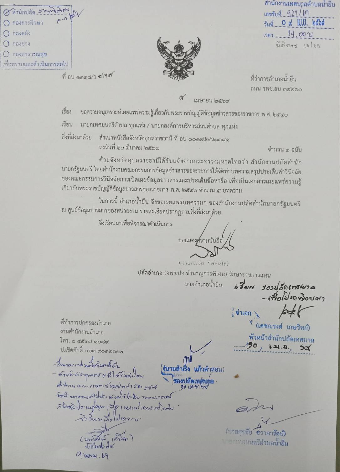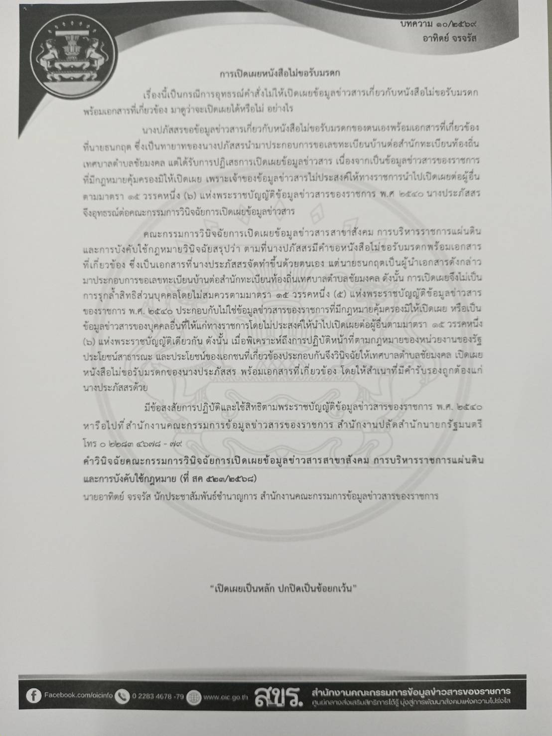 ด้วยจังหวัดอุบลราชธานีได้รับแจ้งจากกระทรวงมหาดไทยว่า สำนักปลัดสำนักนายกรัฐมนตรี โดยสำนักงานคณะกรรมการข้อมูลข่าวสารของราชการได้จัดทำบทความสรุปประเด็นคำวินิจฉัยของคณะกรรมการวินิจฉัยการเปิดเผยข้อมูลข่าวสารและประเด็นหารือ เพื่อเป็นเอกสารเผยแพร่ความรู้เกี่ยวกับพระราชบัญญัติข้อมูลข่าวสารของราชการ พ.ศ. 2540 จำนวน 5 บทความ