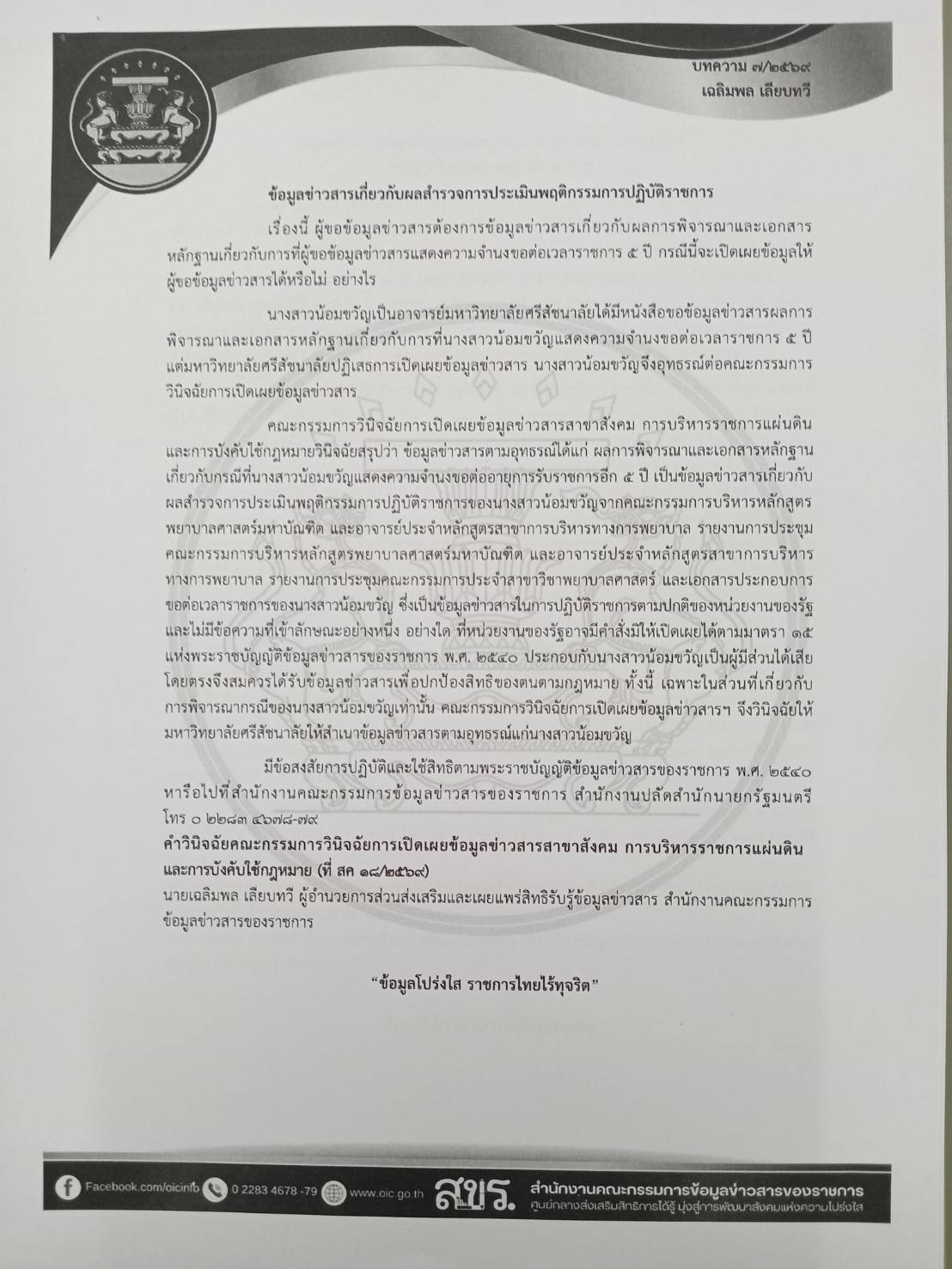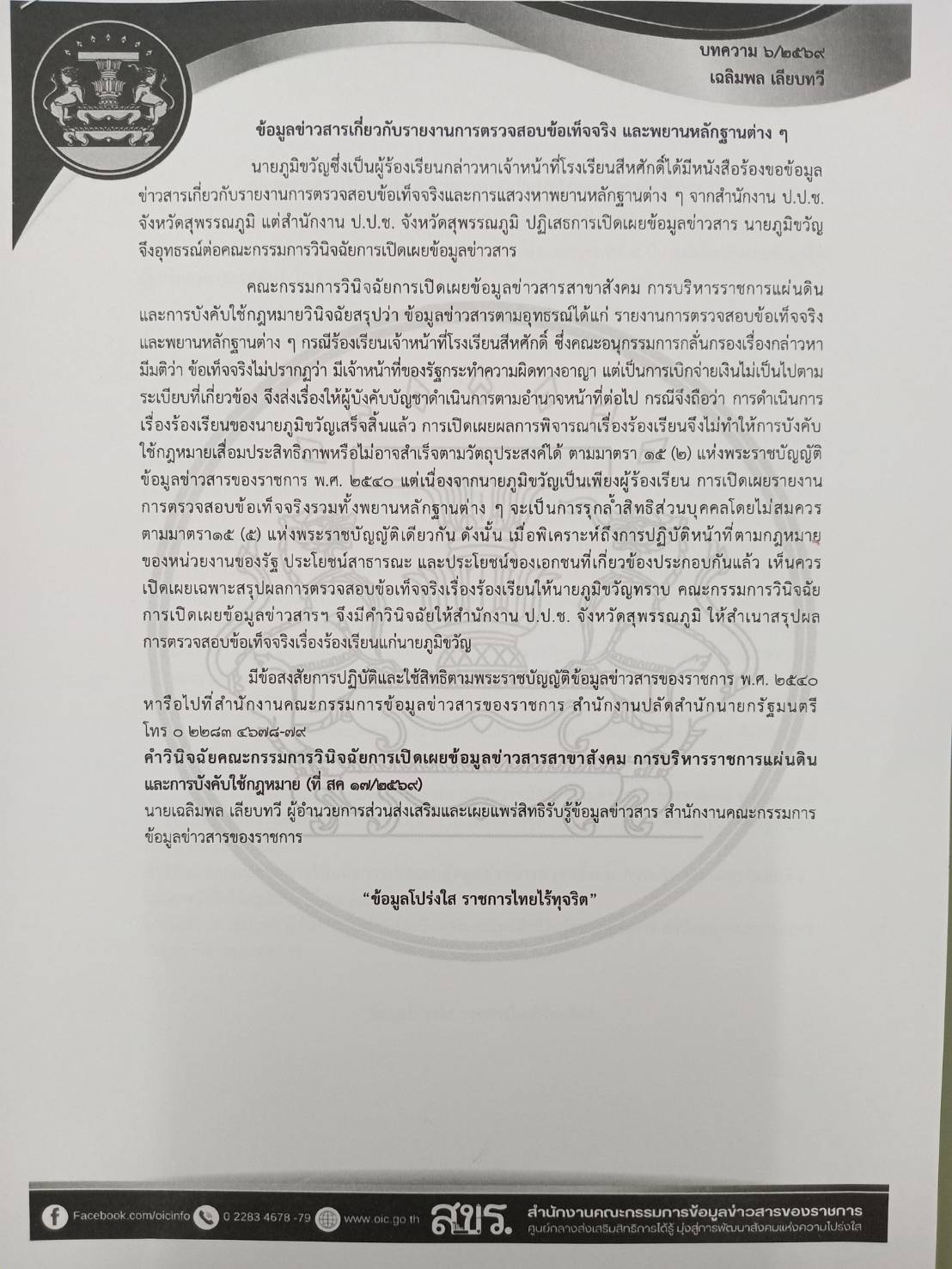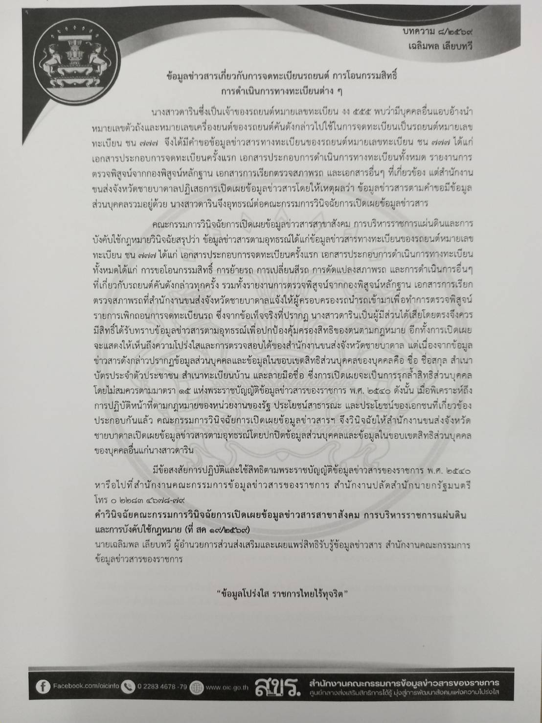ด้วยจังหวัดอุบลราชธานีได้รับแจ้งจากกระทรวงมหาดไทยว่า สำนักปลัดสำนักนายกรัฐมนตรี โดยสำนักงานคณะกรรมการข้อมูลข่าวสารของราชการได้จัดทำบทความสรุปประเด็นคำวินิจฉัยของคณะกรรมการวินิจฉัยการเปิดเผยข้อมูลข่าวสารและประเด็นหารือ เพื่อเป็นเอกสารเผยแพร่ความรู้เกี่ยวกับพระราชบัญญัติข้อมูลข่าวสารของราชการ พ.ศ. 2540 จำนวน 5 บทความ